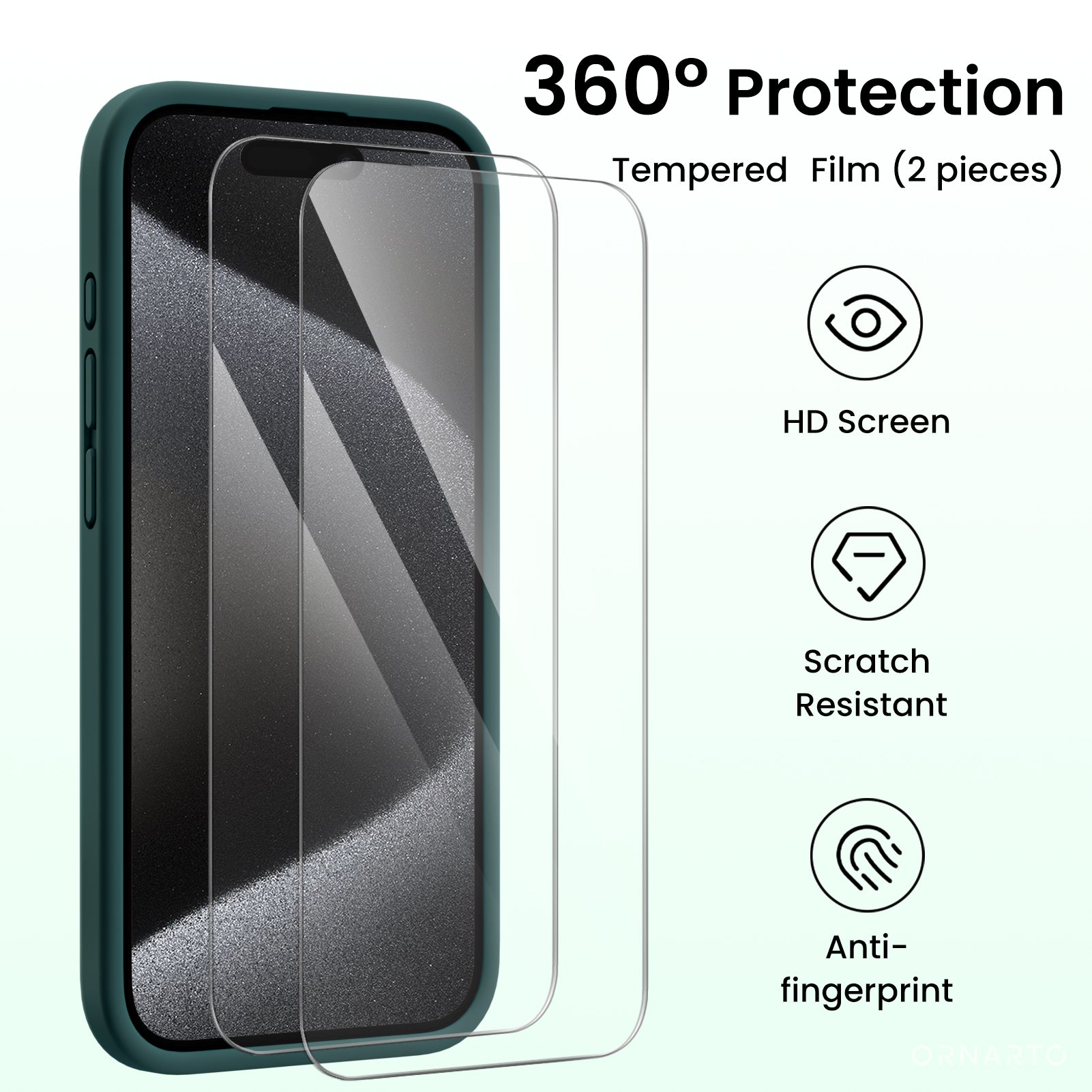 Liquid silicone iPhone 15 Pro case with soft-touch finish, 2 tempered glass protectors, anti-dust design, microfiber lining, full body protection, multi-layer durability, wireless charging support, and multiple colors.